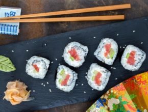 ИНГРЕДИЕНТЫ 2 стакана риса для суши 4 больших листа нори с кунжутом Blue dragon 200 г лосося куском 1 длинноплодный огурец 1 большое очень спелое